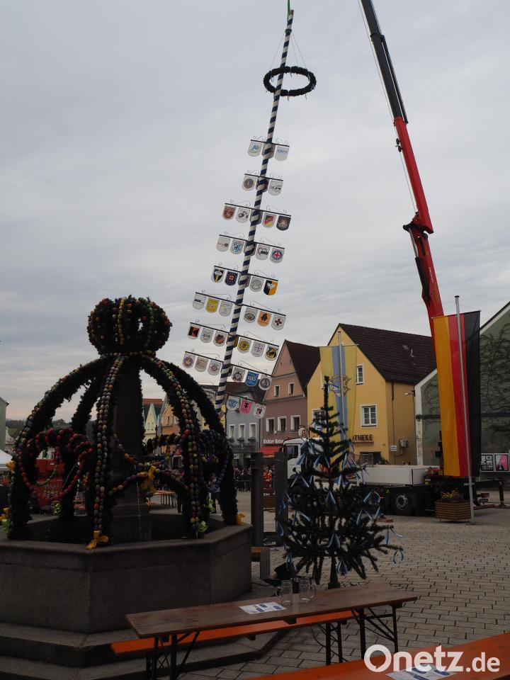 Genau zwei Jahre musste Sebastian Dippold darauf warten, bis er mit den Bürgern sein erstes Freiluftfest als Stadtoberhaupt feiern durfte. Dazu spendierte der Bürgermeister 100 Liter Freibier. Doch zunächst wurde der Maibaum mit dem Kran der Firma Kreuzer aus Lanz in die richtige Stellung gebracht. Das große Gewicht und die Vereinswappen am Baum machen eine manuelle Aufstellung beinahe unmöglich. Mit Hilfe der Feuerwehrleiter wurde dann auch noch die Spitze befestigt. Dann setzte sich der kleine Festzug vom Rathaus zum Neuen Schloss in Bewegung. Angeführt von der Stadtkapelle marschierten die Bürgerwehr, die Kindertanzgruppe des Trachtenvereins unter Leitung von Vronita Grünauer, und der Stadtrat über den Stadtplatz.