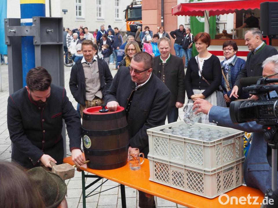 Rudi Bäumler vom OWV sprach nach einem Salut Worte zum Maibaumfest. Dann zeigte das Stadtoberhaupt sein Können beim Anzapfen, brauchte aber mehr als drei Schläge. Die Bürgerwehr übernahm die Bewirtung mit kühlen Getränken, Kuchen und Kaffee.