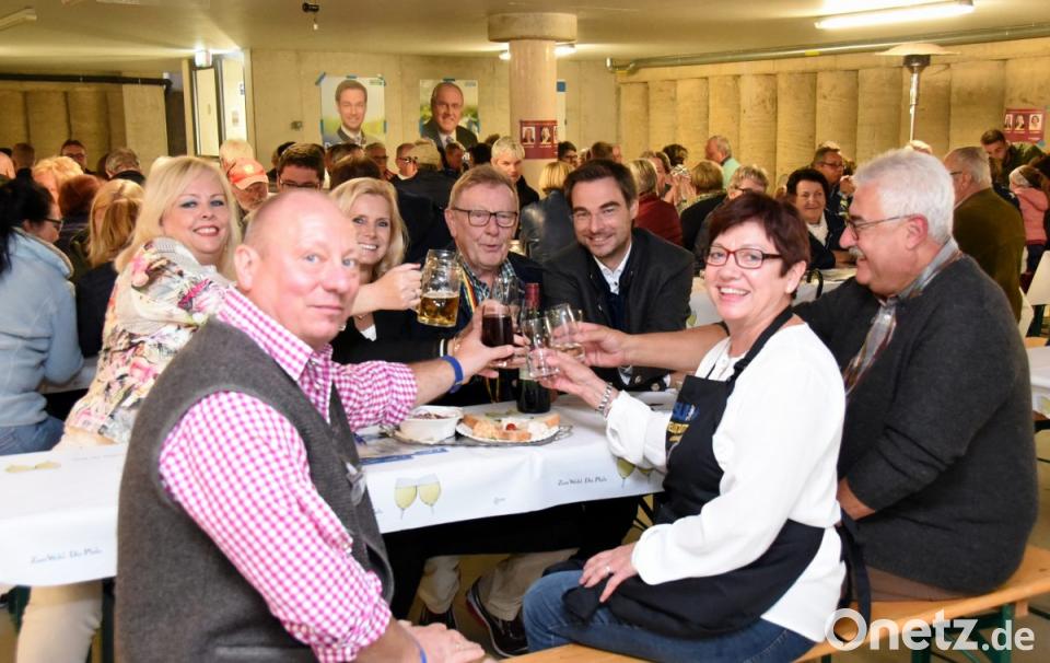 Schatzmeister Hans Schreyegg (Mitte) hat die Weine ausgesucht, die die Neustädter CSU um (vorne, von links) Thomas Spörl, Marianne Lebegern und Rupert Troppmann bei ihrem Weinfest anbietet. Auch Dagmar Nachtigall (zweite Reihe von links) und Andrea Lang statten den Neustädtern einen Besuch ab.