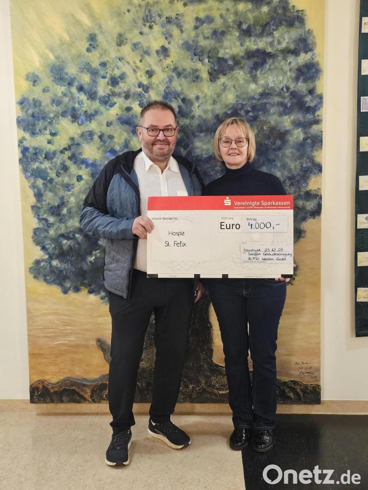 Die Gebäudereinigungsfirmen Seiffert und Alfri unterstützen wieder das Hospiz Sankt Felix mit einer Spende. Damit setzen laut einer Mitteilung ihr kontinuierliches Engagement für soziale Einrichtungen in der Region fort. Mit der 4000-Euro-Spende möchten die beteiligten Unternehmen demnach einen Beitrag dazu leisten, schwerkranken Menschen und ihren Angehörigen eine würdevolle Begleitung in der letzten Lebensphase zu ermöglichen. Das Hospiz Sankt Felix leiste seit vielen Jahren eine unverzichtbare Arbeit und sei dabei in hohem Maße auf Spenden angewiesen.