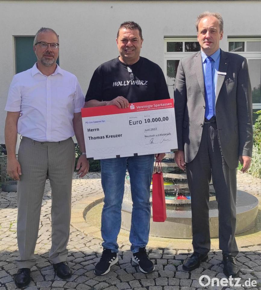 Eine besondere Überraschung hatten Kundenberater Thomas Geiler und Filialdirektor Wolfgang Huber von der Sparkassen-Geschäftsstelle in Neustadt/WN für Thomas Kreuzer. Bei der PS-Auslosung im Mai 2022 hat er satte 10.000 Euro gewonnen, wie aus einer Pressemitteilung der Sparkasse hervorging. Das Glück scheint den fleißigen Sparern im Landkreis Neustadt hold zu sein, denn auch im vergangenen Jahr gab es einige Gewinner.