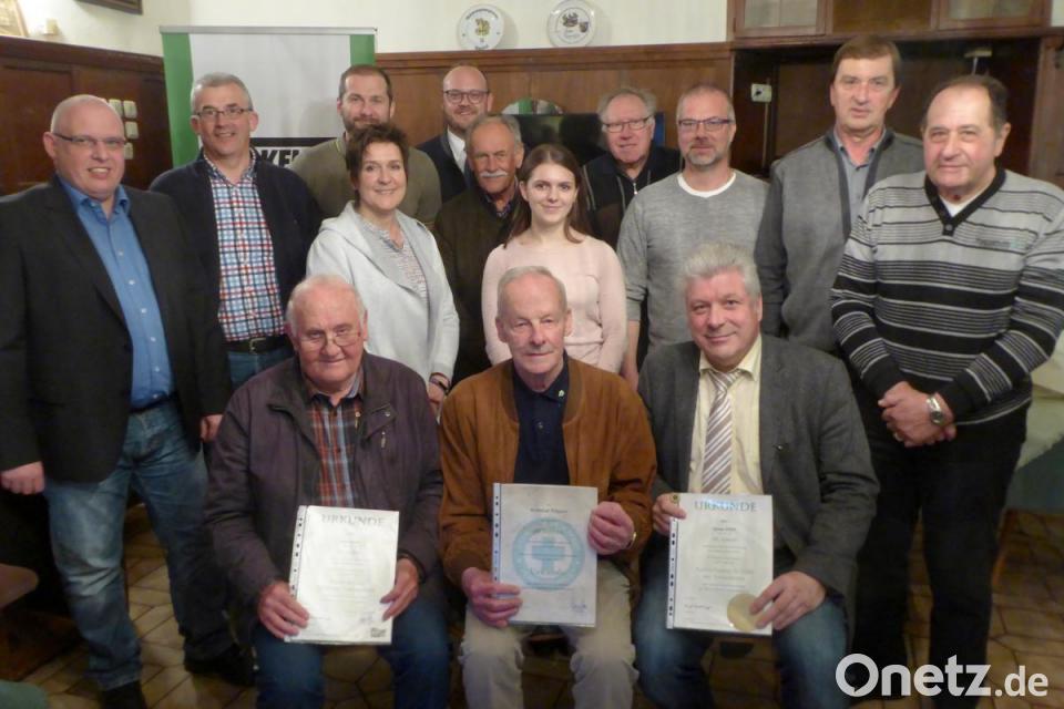 Vorsitzender Andreas Meier zeichnete drei Mitglieder für jahrzehntelanges verkehrssicheres Führen eines Fahrzeugs im Straßenverkehr mit einer Urkunde aus: Günter Stich für 40 Jahre, Johann Bächer für 50 Jahre und Wilfried Tilgner für 60 Jahre.