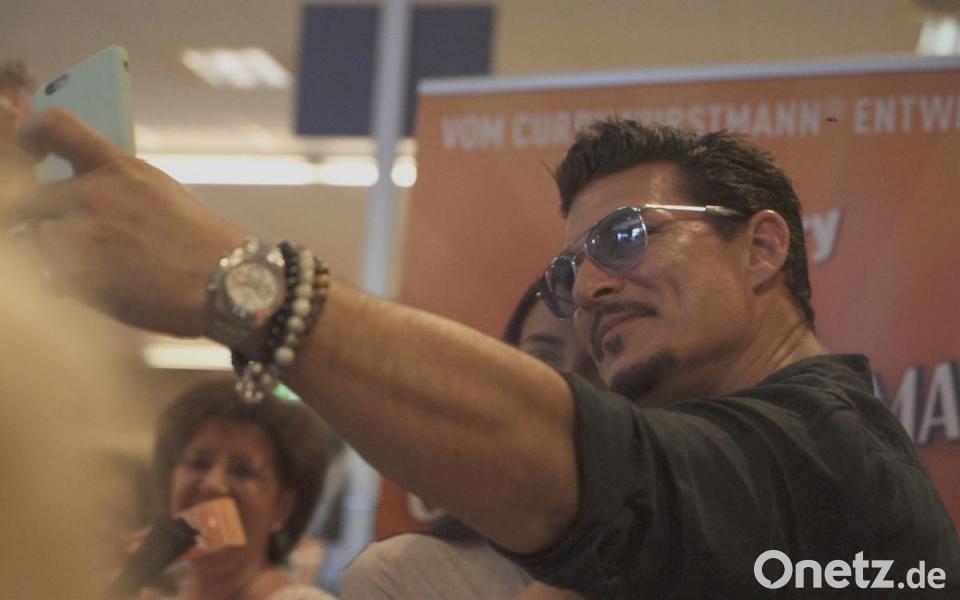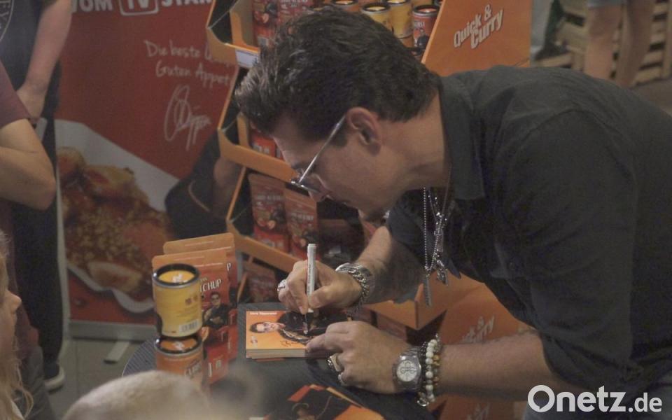 Die meisten kennen ihn von der Auswanderer-Sendung "Goodbye Deutschland", vom "Sommerhaus der Stars" oder spätestens seit seiner Teilnahme im "Dschungelcamp": "Currywurstmann" Chris Töpperwien. Mit seinen beiden Partnern Linus und Colin Banse vom Bayreuther Startup "Quick & Curry" ist er im Juni auf deutschlandweiter Promotion-Tour für Würzmischungen. Am Dienstag macht er Station im E-Center in Neustadt. Gut gelaunt stellt er sich für Selfies und Autogramme zur Verfügung und versorgt die hungrigen Besucher mit Würstchen in Curry-Soße. Im Schlepptau ein Kamera-Team von Sat.1.