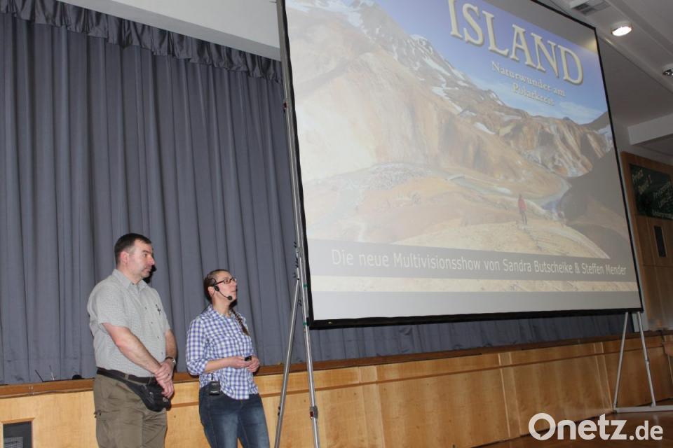 Mit passenden Texten begleiteten die beiden Fotojournalisten abwechselnd ihre Multivisionsshow und entführten das Publikum in der fast vollen Stadthalle an geheimnisvoll blubbernde Schlammtöpfe, heiße Wassergischt ausspuckende Geysire, unberührte Fjorde, Wasserfälle und gewaltige Gletscher. Durch den Besuch von Städten und deren Festen, wie den „Großen Fischtag“ in Dalvik oder die Kulturnacht in Reykjavik zeichneten sie auch ein Bild der Isländer. Auf einer Pferdefarm erfuhren sie viel über die Besonderheiten der Islandpferde und im Haifisch-Museum erklärte ihnen Christian, wie die isländische Spezialität Hákarl hergestellt wird.