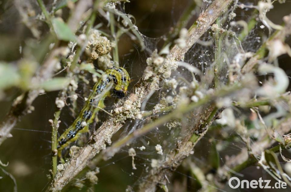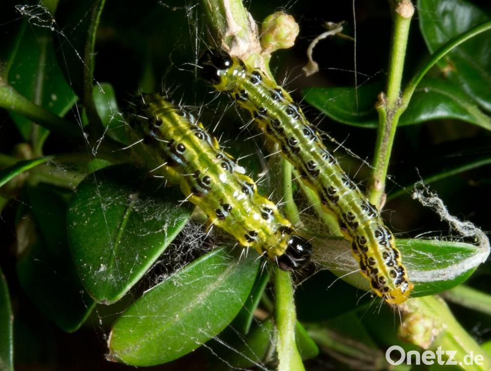 Genau andersherum geht der Buchsbaumzünsler vor. 2006 wurde er das erste Mal in Deutschland gemeldet, eingeschleppt durch internationale Baumschulware. Seitdem breitet er sich von Baden-Württemberg über Südbayern Richtung Norden aus. Es hat bisher keine natürlichen Feinde und "kann sich ungestört ausbreiten", erläutert Thimm-Böhringer. "Somit ist kein Ende des Befalls zu erwarten." Inzwischen hat der Zünsler, der ausschließlich Buchsblätter frisst, schon den Kreis Regensburg und Schwandorf befallen.