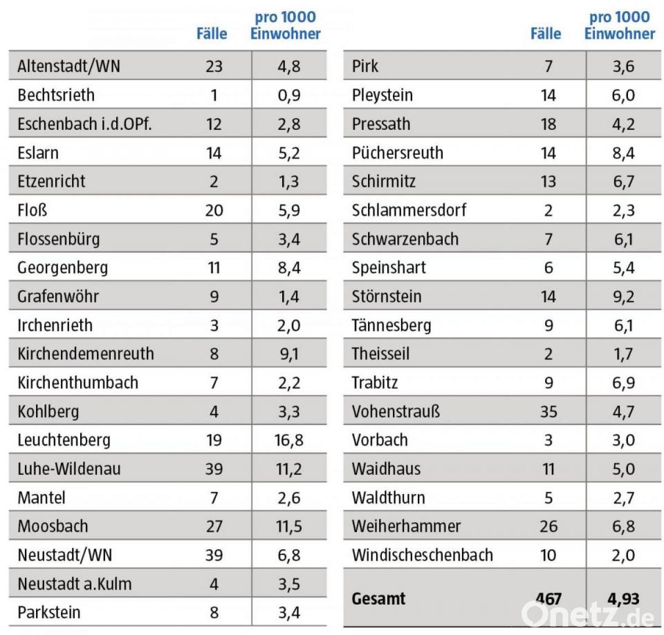 - Stark gestiegen sind die Fallzahlen vor allem in Luhe-Wildenau und Weiherhammer, nämlich um jeweils 21 Fälle im Vergleich zur vorherigen Sieben-Tage-Statistik.