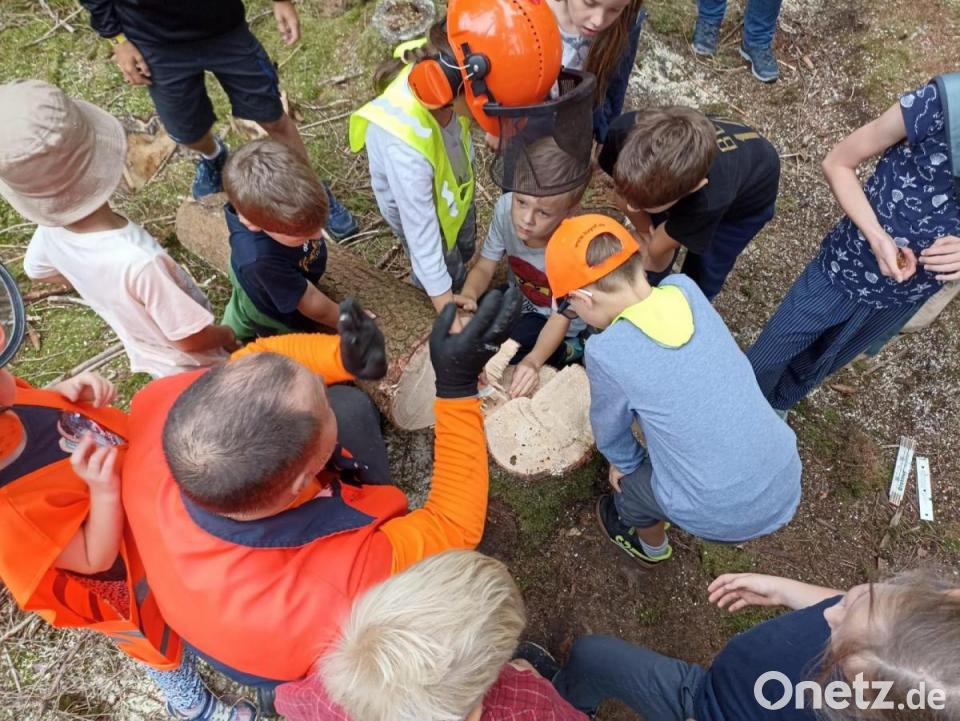 Bäumler erklärte, dass große Bäume in der Erde den Samen ablegen und daraus ohne Zutun des Menschen neue Bäume wachsen. Die Kinder konnten die Aufarbeitung eines liegenden Baumes ebenso erleben, wie die Fällung eines etwa 1,50 Meter hohen Baumstumpfs.