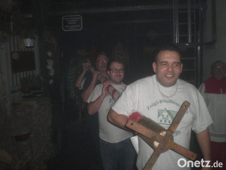 Zoiglpfarrer Rudi Bäumler begleitet am Freitag, 9. November, um 18.30 Uhr das Kirwaausgraben vor der Zoigstube in der Freyung mit seinem Ministranten Hans Spachtholz und den beiden Arbeiter Sepp Nestl und Sepp König. Sie begründeten die Tradition 2003, als die Zoiglstube gerade eröffnet war, erinnert sich die damalige Wirtin Doris Schmid. Hans "Stutz" Völkl hatte die Idee dazu. Man habe einen Brauch wiederbelebt, der zuvor auf der anderen Straßenseite im ehemaligen Gasthaus "Zur Krone" von Willy Hausner gepflegt wurde. Hausner war in der Stadt bekannt als "Mann mit der Schubkarre", so Schmid.