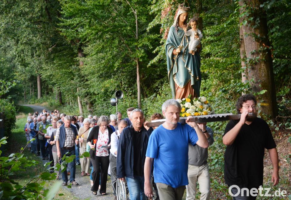 (ms) So viele Gläubige wie noch nie ließen den Feiertag Mariä Himmelfahrt mit einer eindrucksvollen Andacht ausklingen. Weit über 100 Teilnehmer, darunter auch zahlreiche Kinder, versammelten sich mit Einbruch der Dunkelheit zur Marienfeier in und vor der Bildkapelle. Sie beteten mit Stadtpfarrer Josef Häring zur himmlischen Mutter. Dann zogen sie mit der mit Blumen schön geschmückten Mutter-Gottes-Statue in einer Lichterprozession im Schein vieler Kerzen singend und betend durch den Felixwald zur Felixkirche. Nach der Weihe an die Muttergottes, unserer Fürsprecherin im Himmel, und Fürbitten spendete Geistlicher Rat Häring den eucharistischen Segen. Die Initiatoren Christine Caloiero und Josef Ziegler freuten sich, dass die inzwischen zehnte Marienandacht so gut angenommen worden ist.