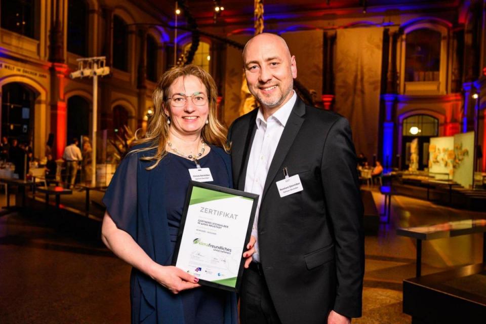Neustadt/WN. (prh) Nachhaltigkeit sowie eine klima- und ressourcenschonende Produktion sind für Reinhard und Christa Steinhilber schon seit Jahren eine Herzensangelegenheit. Als Lohn für ihr Engagement auf diesem Gebiet erhielten sie kürzlich im Berliner Naturkundemuseum im Rahmen eines Festakts das Nachhaltigkeitssiegel „klimafreundliches Unternehmen“ des Klimaverbundes Mittelstand verliehen. Gefördert wurde das Projekt durch das Bundesministerium für Umwelt, Naturschutz und nukleare Sicherheit. Svenja Schulze, Bundesministerin für wirtschaftliche Zusammenarbeit und Entwicklung, hielt eine Gastrede.