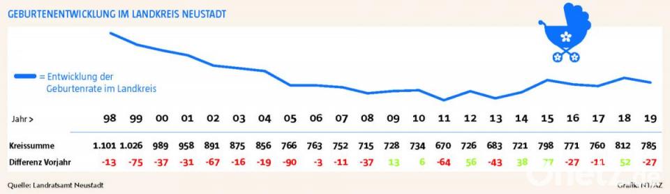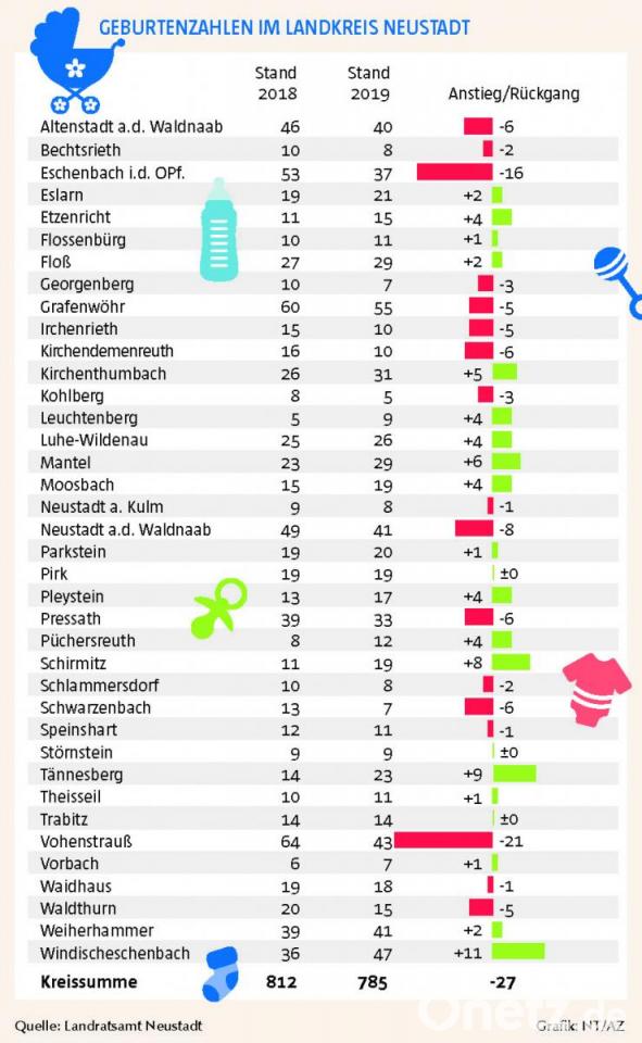 Kurios an den Zahlen ist übrigens, dass es den Anschein hat, als hätten zwei Gemeinden ganz genau geplant, wie viele Kinder dort innerhalb eines Jahres zur Welt kommen. Sowohl in Störnstein (9) als auch in Pirk (19) haben die Mütter 2019 genauso viele Kinder geboren wie schon 2018.