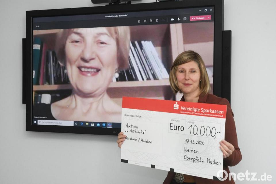 Über die stattliche Summe von 10.000 Euro für Unverschuldet in Not geratene Menschen in der Region freuen sich Schirmherrin Elisabeth Wittmann und geschäftsführende Verlegerin Viola Vogelsang-Reichl, auch wenn die symbolische Scheckübergabe in diesem Jahr nicht wie gewohnt im Büro und in Anwesenheit von Altverlegerin Bärbel Panzer stattfinden konnte, sondern über den Bildschirm erfolgen musste.