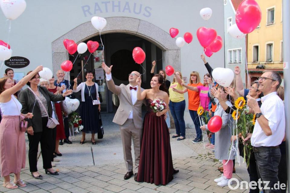 Am Ende stiegen viele bunte Luftballons mit den besten Glückwünschen für die frisch Vermählten in den weißblauen Himmel über der Kreisstadt. Zur anschließenden Feier im kleinen Rahmen in einem Lokal in der Weidener Altstadt fuhr das Brautpaar im schicken weißen BMW-Sportcabriolet. Den Termin zur kirchlichen Trauung haben die beiden für den 9.9.2023 im Kalender festgehalten.