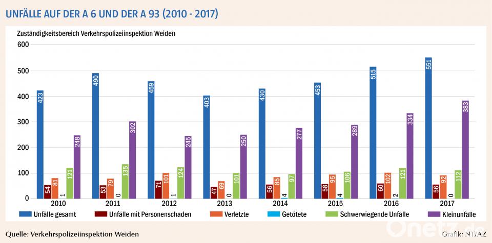 (ms) Eindrucksvolle Zahlen vermittelt das Verkehrslagebild der Verkehrspolizeiinspektion (VPI) Weiden für das Jahr 2017. Die Dienststelle ist zuständig für 80 Kilometer Autobahn: 58 Kilometer auf der A 93 zwischen den Anschlussstellen Pechbrunn und Wernberg sowie 22 Kilometer auf der A 6 von der Anschlussstelle Leuchtenberg bis zur tschechischen Landesgrenze.