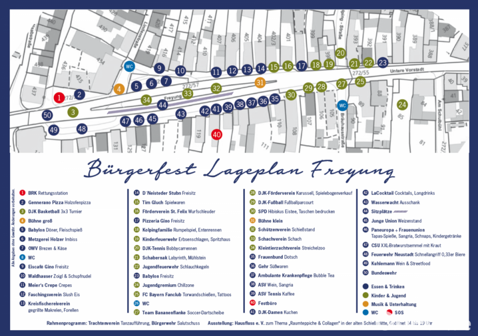 Wegen des Bürgerfests wird die Ortsdurchfahrt von Samstag, 19. Juli, 8 Uhr bis Sonntag, 20. Juli, 12 Uhr gesperrt. Bushaltestellen in der Freyung und am Stadtplatz entfallen in dieser Zeit. Parkplätze ab Untere Vorstadt bis zur Ampelanlage am Hotel Grader sind für den Festbetrieb gesperrt. Die Parkplätze am Stadtplatz bleiben erreichbar.