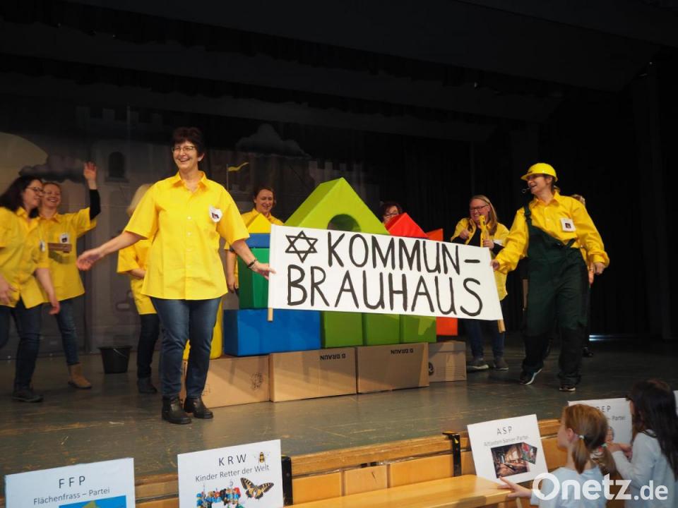 Eindrucksvoll, wie die ASP (Altlasten-Sanier-Partei), die Schmetterling-Gruppe von Annerose Stempfle, die Neustädter Brachen besiedelten. Die Raupe Nimmersatt von der FFP (Flächenfrass-Partei) schlängelte sich durch den Saal. Die Rentner-Partei ZOEP (Zeit-ohne-Ende-Partei, mit Erika Neid und Sigrid Gierisch) erzählte davon, dass es sich ohne Uhr prächtig leben lasse. Marianne Lebegern und Maria Färber standen für die UP (Unterhaltungspartei), die etwas musikalischen Schwung in die Kreisstadt bringen wollte. Das nächste Großprojekt der Stadt, den nördlichen Abschluss des Stadtplatzes mit Kommunbrauhaus, hatte sich die FPP (Frauenpower-packt-an-Partei) als Wahlziel gesetzt. Unter der Leitung von Kerstin Aichinger wurde das Bauwerk schnell vollendet.