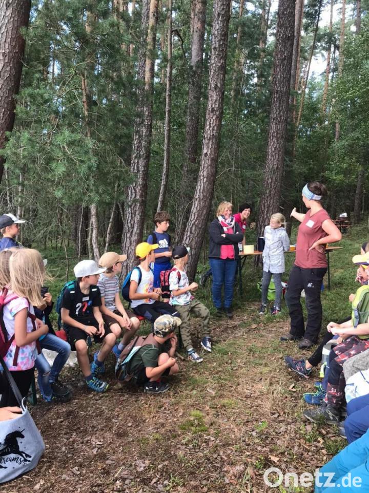 Bei perfektem Wetter für einen Nachmittag im Wald gingen die 25 Kinder vorbei am Kindergarten St. Martin zum Bocklradweg in Richtung Störnstein. Im Wald der Familie Meiler hießen Försterin Moni Werner und Caroline Würth die Buben und Mädchen willkommen. Die Kinder waren gespannt, was auf sie zukommt. Zuerst gab es für sie ein Begrüßungsgetränk und Butterbrote oder leckeres Schnittlauchbrot. Dazu gab es Wasser mit Waldmeistersirup.