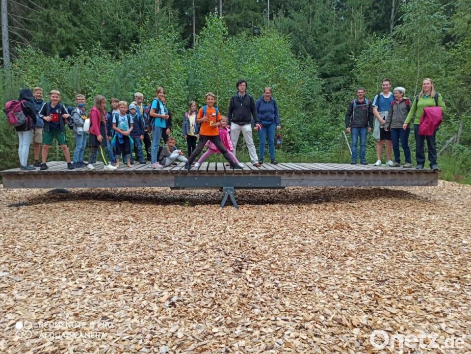 Auf den letzten Bahnen der Minigolfanlage gab es dann auch eine Gratisdusche für alle in Form eines Regenschauers. Glücklicherweise besserte sich das Wetter kurze Zeit später wieder. Der Erlebniswanderung auf dem Holzweg mit verschiedenen Spielstationen, Floßfahren, Klettern und dem Wippen auf einem XXL-Balancierbalken stand also nichts mehr im Wege. Maria Gleißner, die die Erlebniswanderung organisiert hatte, versüßte den Kindern und Jugendlichen die Wanderung zusätzlich mit Schokolade, Keksen und Gummibären.