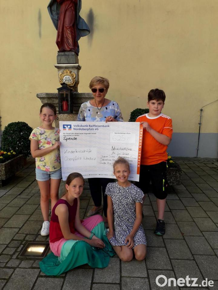 Die Spendenübergabe der Neustädter Kommunionkinder vom Oktober 2020 konnte coronabedingt erst jetzt vor der Pfarrkirche Neustadt stattfinden. Sara Bauer, Franz Leopold, Emma Herbrecher, Paul Döbereiner und Mia Guida spendeten 625 Euro für krebs- und schwerstkranke Kinder in der nördlichen Oberpfalz. Vorstandsmitglied Petra Troppmann dankte im Namen der Kinderkrebshilfe Oberpfalz Nord und erklärte den Kindern, wozu ihre Spende verwendet wird.