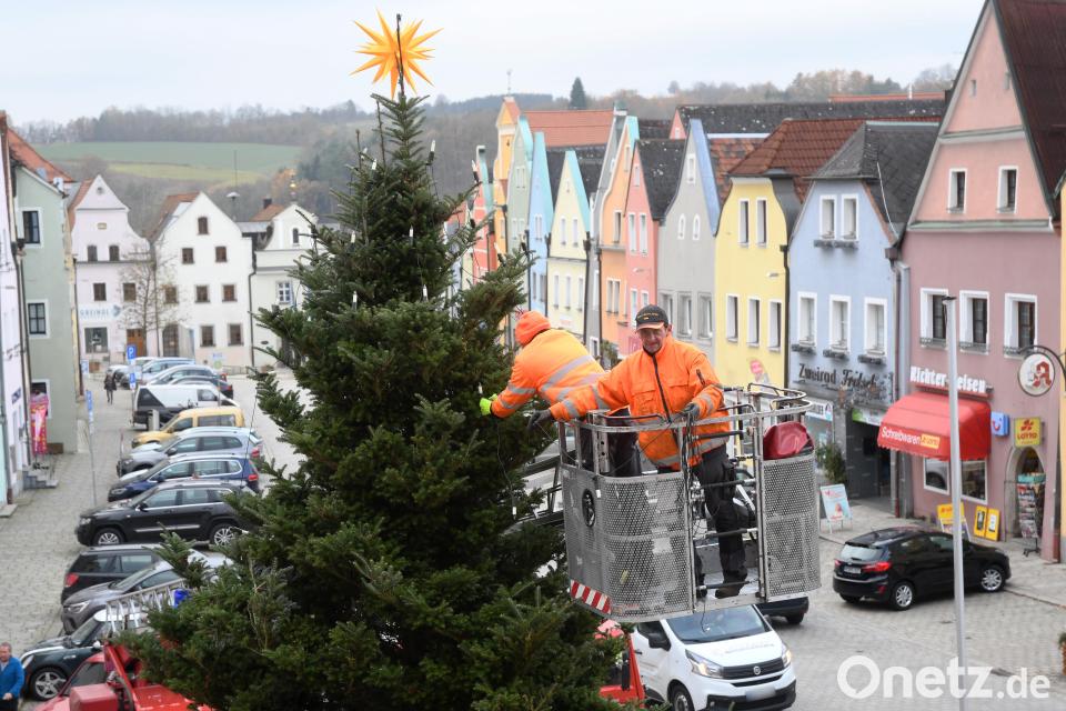 Die Nordmann-Tanne ist unter den Christbäumen der beliebteste Baum. Die Bauhofmitarbeiter schmückten das Exemplar auf dem Stadtplatz mit Hilfe einer Drehleiter mit 200 Lampen und einem Herrnhuter Stern an der Spitze. Demnächst werde in der Stadt noch die restliche Beleuchtung angebracht. "Es fehlen nur noch die Kometen und die Girlanden mit den Sternen", sagt Lang, der mit seinem Team für die festliche Ausgestaltung der Stadt sorgt.
