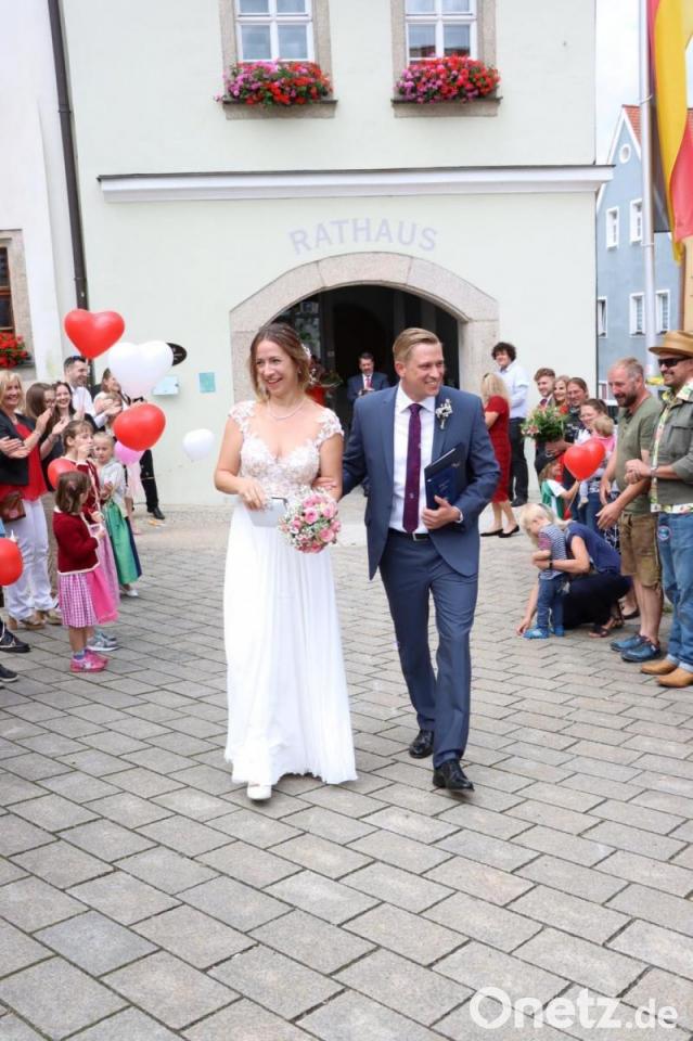 Die standesamtliche Trauung vollzog im Neustädter Rathaus der Standesbeamte Peter Spachtholz. Und eine Besonderheit wurde wegen „Corona“ organisiert: Michael Knauer und Leonie Luber übertrugen die standesamtliche Zeremonie mit Handy und Tablet-PC vom Trauungszimmer auf den Rathausvorplatz, wo alle weiteren Gäste die Trauung live mitverfolgen konnten. Als sich Lucia und Tobias das „Ja-Wort“ gaben, gab es stürmischen Beifall vom Rathausplatz.