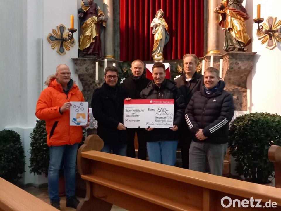 Der Nikolausbesuchsdienst der Kolpingsfamilie hat in Neustadt eine lange Tradition. Auch heuer waren Oliver Völkl, Armin Aichinger, Rainer Hetz, Wolfgang Huber und Martin Schmidtberger als Heilige Männer verkleidet im Stadtgebiet unterwegs. Sie besuchten und beschenkten dabei die Kinder von über 30 Familien. Die zeigten sich heuer als Dank besonders spendabel, sodass der Besuchsdienst ein Rekordergebnis von 600 Euro an Spenden einnahm. Die Nikoläuse haben auch die ukrainischen Kinder im Container-Dorf besucht. Der Erlös aus der Aktion kommt den Ministranten der Pfarrei St. Georg zugute und wurde in der Stadtpfarrkirche symbolisch an Oberministrant Alexander Schmid übergeben. Mit dem Geld wird nächstes Jahre die internationale Rom-Wallfahrt der Ministranten finanziell unterstützt, an der auch eine Gruppe der Pfarreiengemeinschaft teilnimmt.