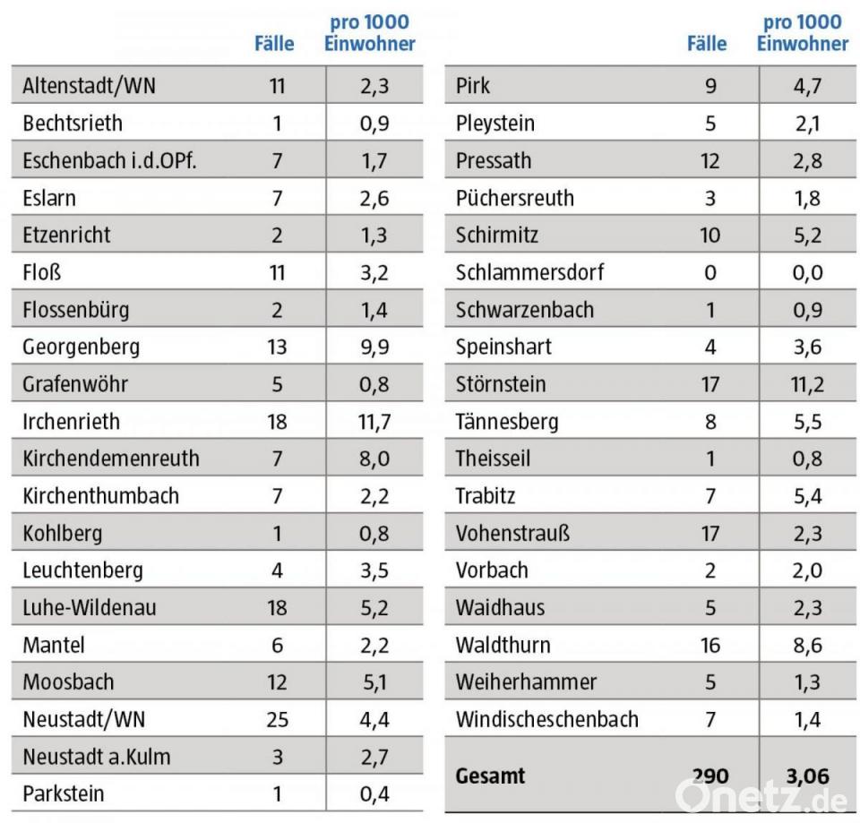 - Die meisten Fälle sind mit 25 in Neustadt/WN nachgewiesen worden, 22 mehr als in der Vorwoche. Dahinter folgen Irchenrieth mit 18 (+15) und Luhe-Wildenau mit ebenfalls 18 (+14). In Störnstein (+16) und Vohenstrauß (+6) sind jeweils 17 Corona-Infektionen dokumentiert.