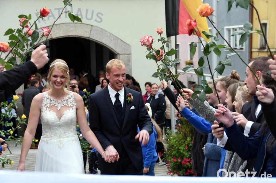 Nach einem großangelegten Polterabend auf dem Hof am Ortsrand von Störnstein stand nun auch die standesamtlich Trauung im Rathaus Neustadt auf dem Programm. Neben Familie und Freunden gratulierten die Kolleginnen der Braut vom Kindergarten Neuhaus, die mit der ganzen Kindergruppe musikalisch für den gemeinsamen Weg Glück wünschten. Der Faschingsverein, in dem Braut und Bräutigam als Trainerin und Schriftführer weiterhin aktiv sind, war mit einer großen Abordnung von Kinder-, Jugend- und Prinzengarde, Elferrat und der gesamten Vorstandschaft angetreten, um sein Ex-Prinzenpaar durch ein langes Rosenspalier zu geleiten.