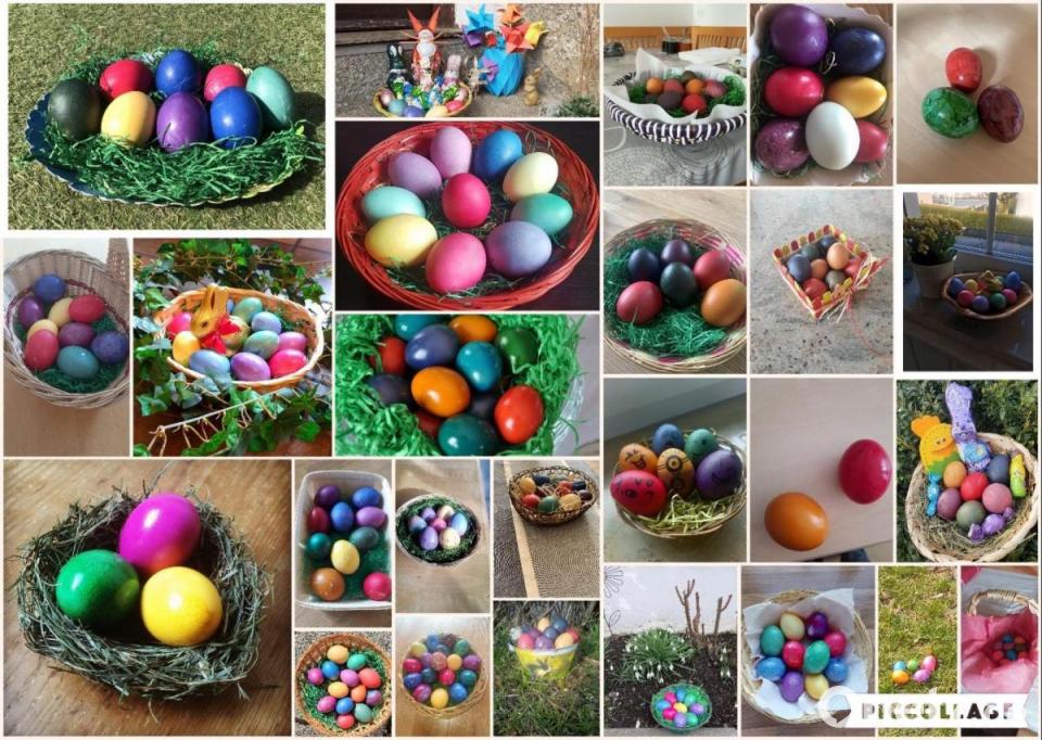 Im Anschluss an diese ungewöhnliche Unterrichtsstunde drappierten die Neuntklässler ihre Werke und luden in Microsoft Teams Fotos der bunten Nester hoch. Daraus bastelte die Lehrerin eine Collage.