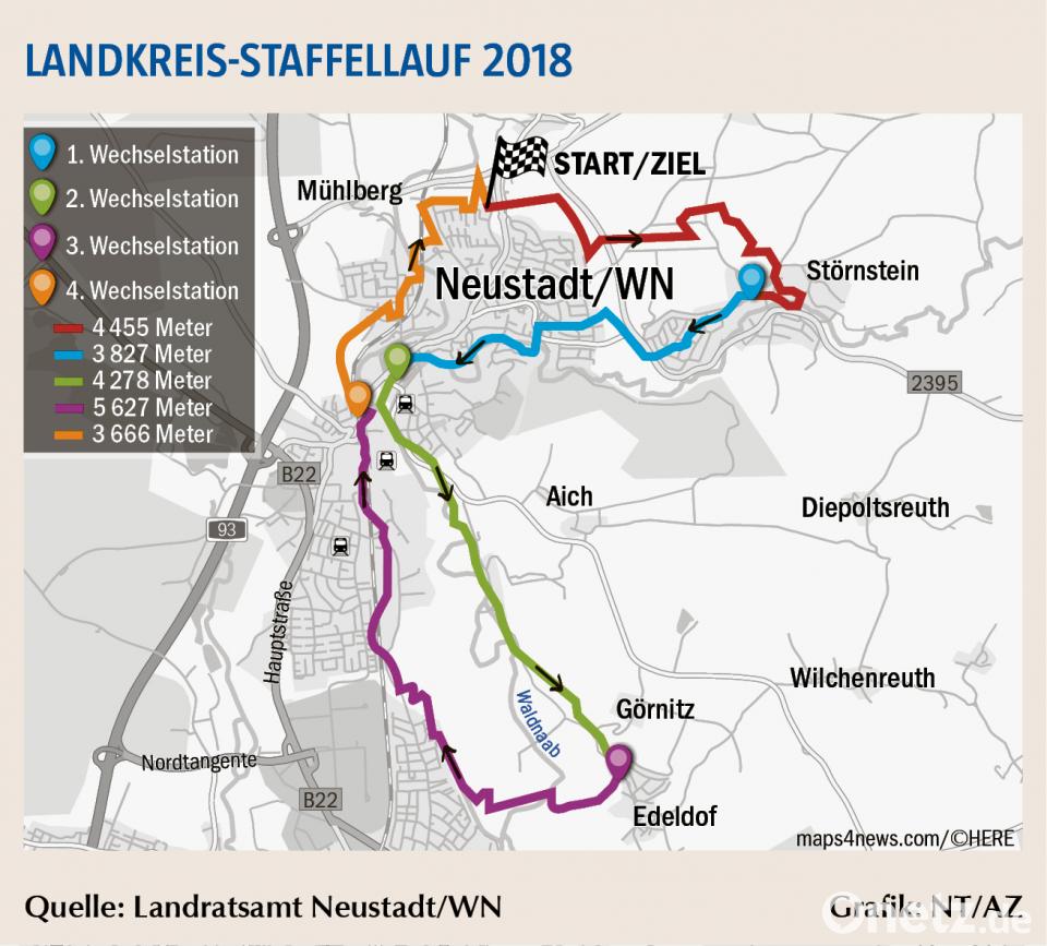 Laut Hannes Gilch, Referent für Regionalmarketing im Landratsamt, wurde wie schon im Vorjahr die Teilnehmerzahl in einem Team von sieben auf fünf reduziert. Das soll es erleichtern, eine Staffel auf die Beine zu stellen. Teilnehmen kann jeder, er muss nicht im Landkreis wohnen. Mit der Einteilung in vier Klassen - Damen, Herren, Mixed, Jugend (U 16) - wird mehr Ausgewogenheit erreicht. Ausrichter ist die DJK Neustadt. Die Strecke mit Start und Ziel an der Sportanlage führt als Rundkurs mit insgesamt 21,8 Kilometern Länge über Störnstein, Harlesberg, Edeldorf, Weiden und Altenstadt. Das sind die einzelnen Streckenabschnitte.
