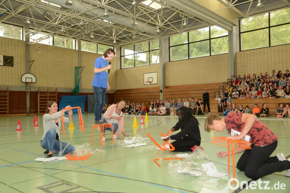 Ein guter Grund für die Abiturienten, mal in die Zimmer zu gehen, um die Lehrkräfte "nicht entwischen zu lassen". Dann wurde es gleich zu Beginn für Studienreferendarin Felicia Harris und Studienrätin Evelyne Häupl ernst. Ihre Aufgabe: Einen Metallstuhl ohne fremde Hilfe und ohne Werkzeug zusammenzuschrauben. Konkurrenten waren zwei Schüler von der Zuschauertribüne. Doch die Lehrerinnen schienen schon öfter "geschraubt" zu haben.