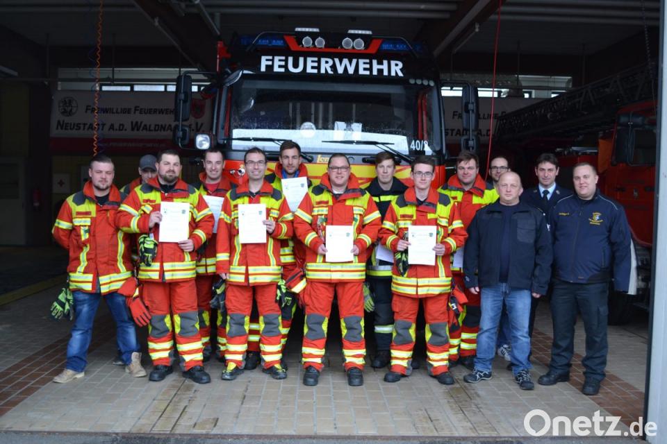 Zum Abschluss erhielten die Lehrgangsteilnehmer ein Zertifikat, überreicht von Kreisbrandinspektor Martin Weig und Kreisbrandmeister Thomas Weidner. Unterstützt haben Andreas Neuzil (Helfer), Dominik Lang (wird Ausbilder) und Sebastian Plödt (Ausbilder). Mit Erfolg teilgenommen haben Christian Höcht (Feuerwehr Windischeschenbach), Dominik Beer, Andreas Dagner, Sebastian Dippold, Andreas Gollwitzer, Stephan Plößner, Maximilian Schwarz, Sebastian Zapf (alle Neustadt)