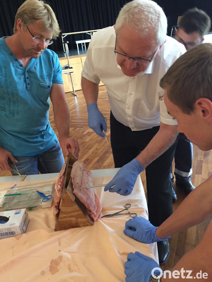 Dies alles hatten Dr. Gudrun Graf und Jürgen Göppl im Abstimmung mit den Ausbildern und Notfallsanitätern Wolfgang Dietl, Jürgen Sollfrank, Patrick Süttner und Robert Schmid ausgezeichnet vorbereitet. Dr. Martin Poschenrieder machte sich im Anschluss mit den Beteiligten an die Manöverkritik. Gefordert waren intraossäre Punktion, Thoraxdrainage und Wundpacking.