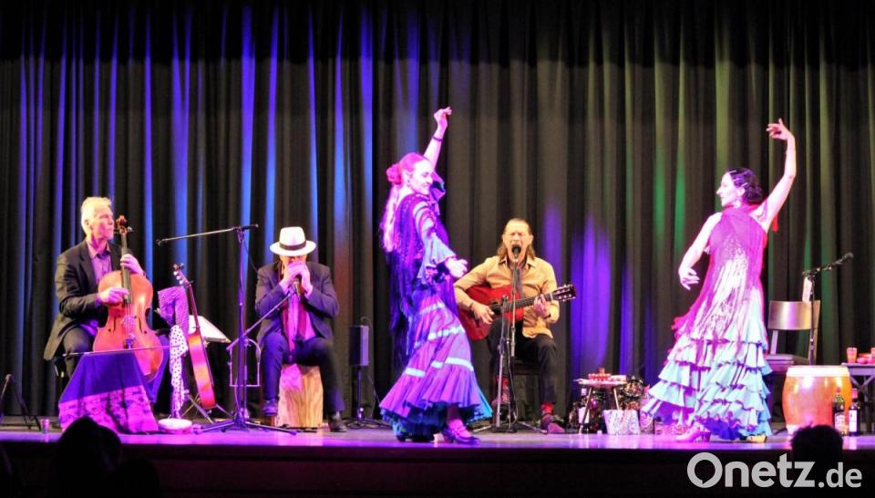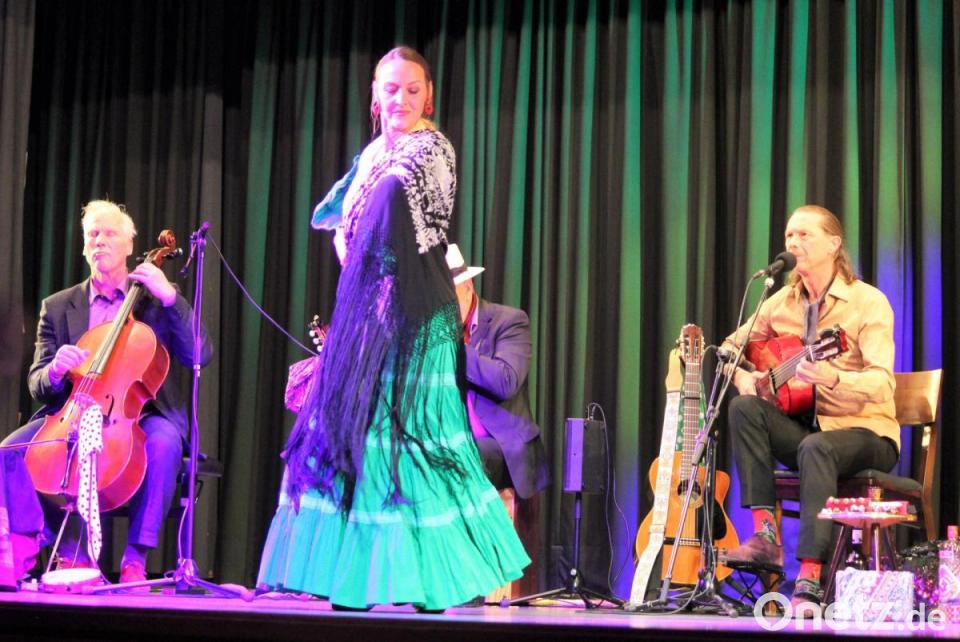 An seiner Seite hatte Ricardo Volkert, der für Gitarre und Gesang zuständig war, als Mitmusiker einen streich- und zupffreudigen Jost-H. Hecker am Violoncello sowie einen spanisch-lässigen Simón „El Quintero“ an Gitarre und Harp. Immer wieder für Verzückung im Publikum sorgten „La Picarona“ sowie Andrea Grüner, wenn sie neben dem Gesang auch noch über die Bühne tanzten und die Kastagnetten aneinanderschlugen. Als Belohnung gab es lange anhaltenden Applaus.