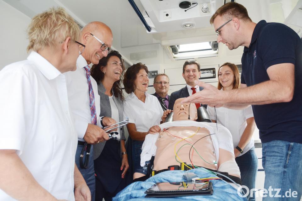 Sie sind von der Puppe, die sogar atmen und weinen kann, begeistert (von links): Edeltraud Sperber vom BRK, Sparda-Vorstandsvorsitzender Georg Thurner, Weidener Filialleiterin Tanja Hochholzer, ärztliche ILS-Leiterin Dr. Gudrun Graf, Sparda-Direktor Dieter Holub, BRK-Kreisverbands-Geschäftsführer Sandro Galitzdörfer, Sandra Ehinger von der Neustädter BRK-Bereitschaft sowie Simultationswagen-Chef Christian Putzer.