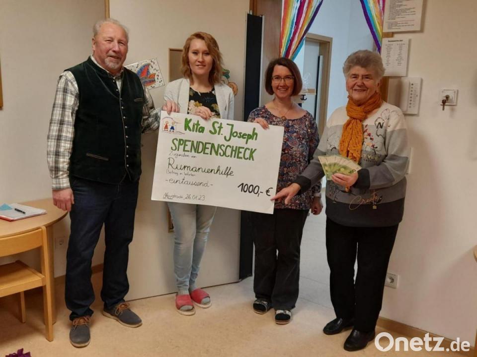 Zu einem erfreulichen Treffen kam es in der Kita St. Joseph in Neustadt. Kita-Leiterin Kerstin Gmehling und ihre Stellvertretung Katrin Plechschmidt begrüßten Erna Hauer und Hermann Schmid von der Rumänienhilfe der katholischen Kirchenstiftung St. Georg, um ihnen eine Spende in Höhe von 1000 Euro zu übergeben. Das Geld stammt aus den Sammlungen der Kita-Familien zu St. Martin und St. Elisabeth der vergangenen beiden Kalenderjahre.