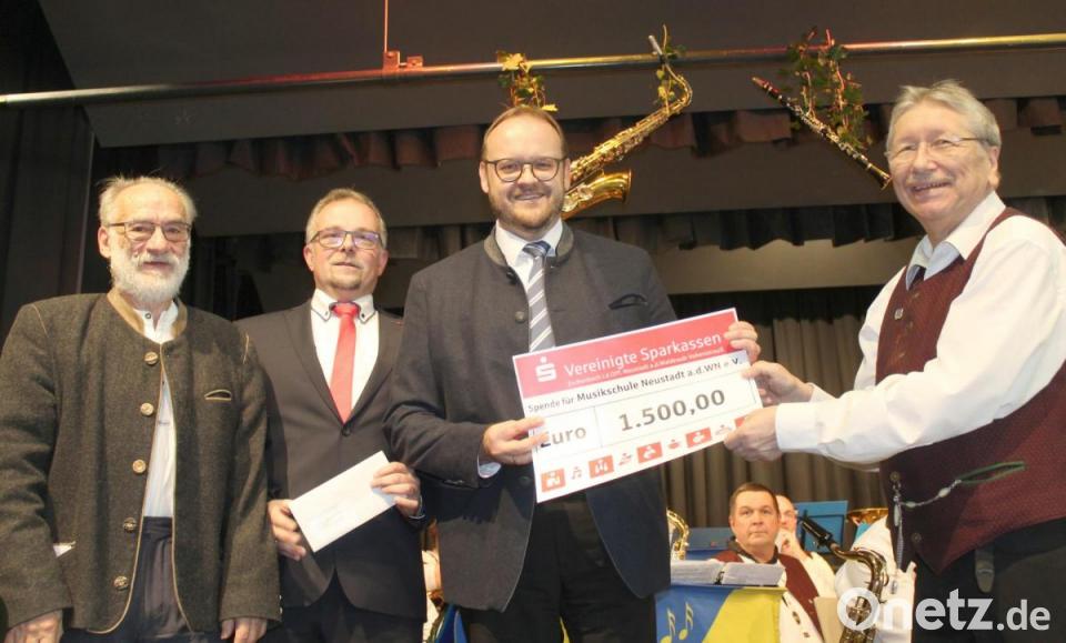 ![Vorsitzender Reinhold Schwarzmeier (von links), Marktdirektor der Vereinigten Sparkassen Thomas Müllner, Landrat Andreas Meier und musikalischer Leiter Karl Wildenauer präsentieren den überdimensionalen Spendenscheck beim Jubiläumskonzert der Stadtkapelle. Bild: Schönberger, Ferdinand [fsb]](https://www.onetz.de/f/ic/Detailed/articlemedia/2019/11/12/cbd85cf9-1467-4fe1-b1af-045d41f7c3ce.jpg)