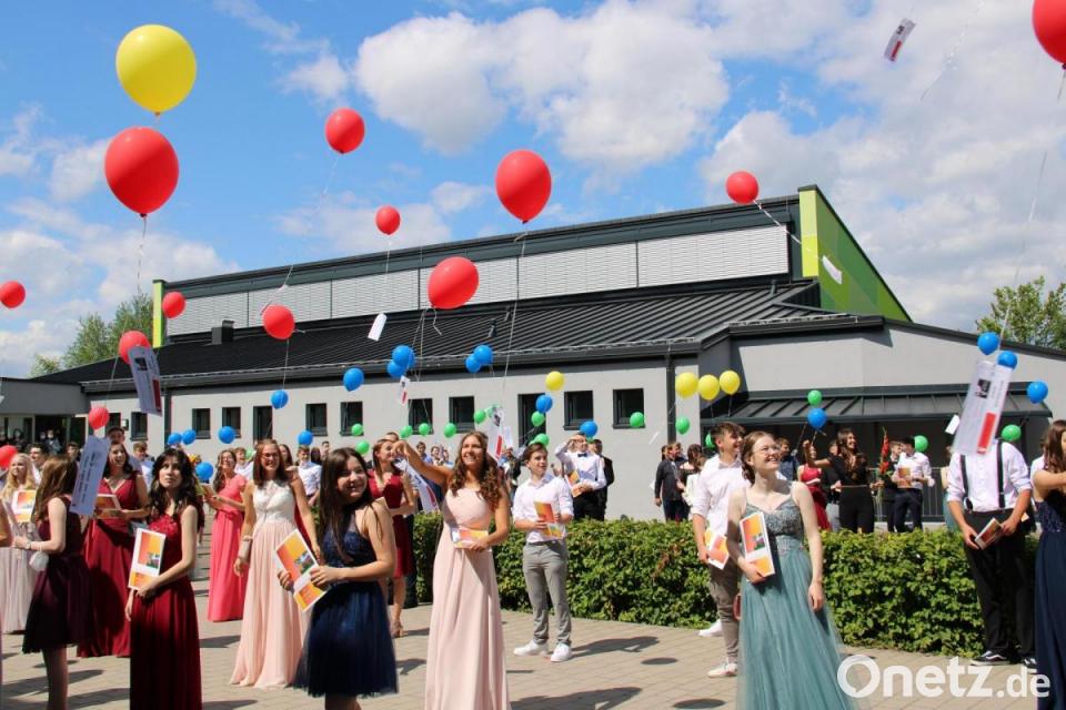 111 bunte Luftballons ließen die Realschulabsolventen versehen mit ihren Wünschen auf dem Pausenhof in den Himmel steigen.