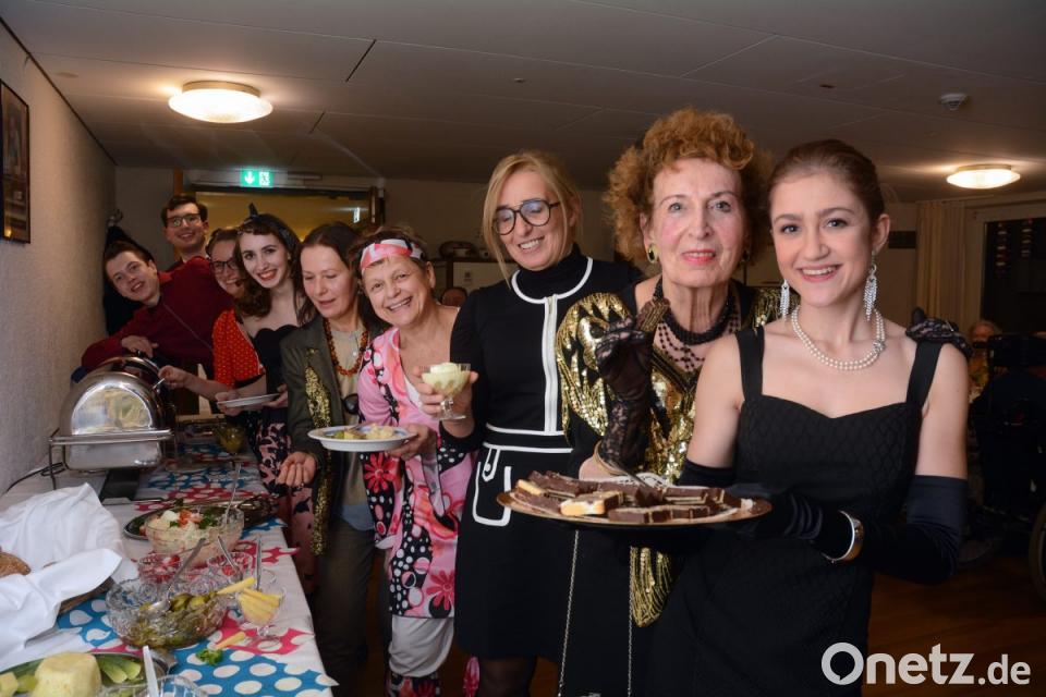 Zurück zur Party: Die Auszubildenden haben für ein großes Büfett gesorgt. Es gibt Finger-Food mit kleinen Kuchen, Buletten, Eiern mit einer halben fliegenpilzähnlichen Tomate mit Majo oben drauf wie es damals eben Mode war. Eine halbe Stunde später ist vom Essen nicht mehr viel übrig. Auch an der Bowle schenken sich die Partygäste fleißig nach. Das alles bietet eine willkommene Abwechslung für die Bewohner. „Sonst werden sie gefragt, was sie essen wollen, und bekommen es dann auf den Tisch gestellt“, erklärt die 20-jährige Elisabeth Zahner.