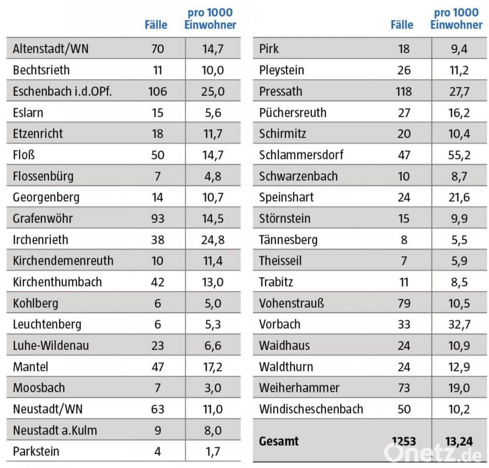 - Die meisten Coronafälle gab es in Pressath (118 Fälle, +51 zur Vorwoche), Eschenbach (106, +79), Grafenwöhr (93, +20), Vohenstrauß (79, +21) und Weiherhammer (73, +29).