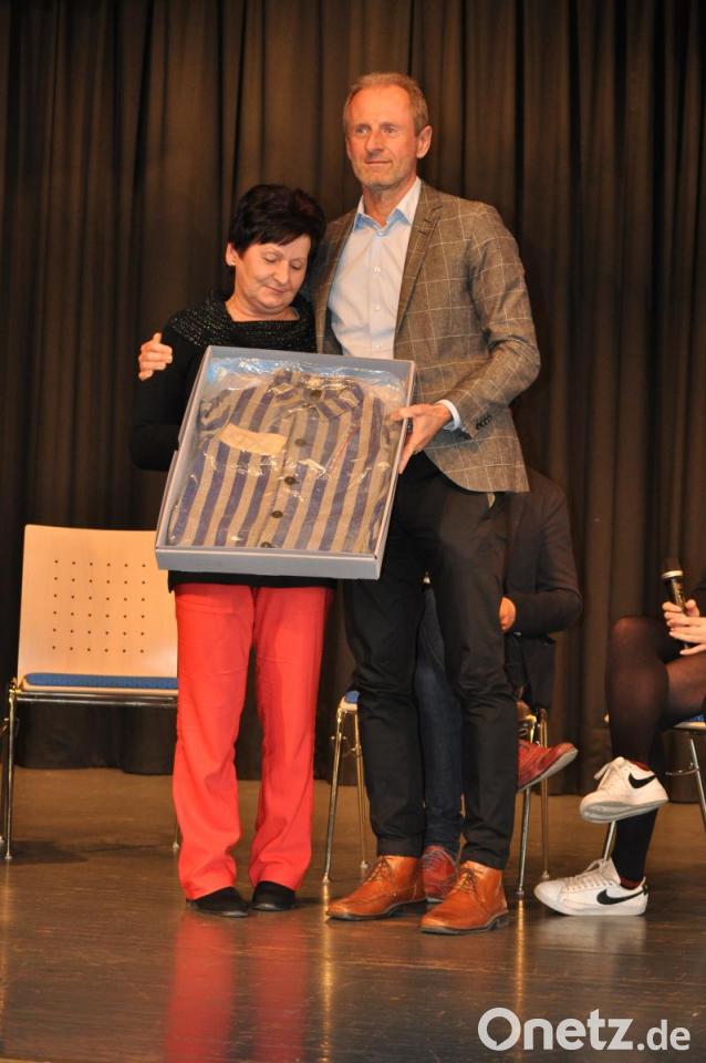 Ein Frau in der Runde bewegte alle Zuhörer ganz besonders. Jolanta Lange aus Polen präsentierte dem völlig überraschten Gedenkstättenleiter Jörg Skriebeleit ein Geschenk: eine gut erhaltene Häftlingsuniform.