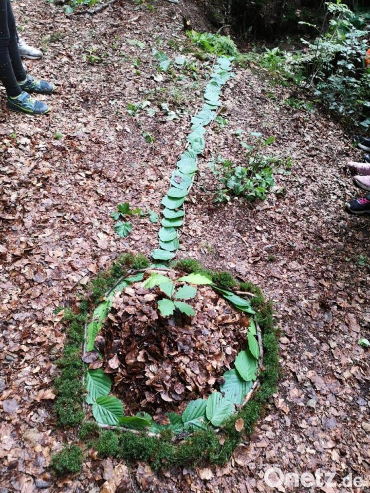Die Kinder hatten nun im Felix-Wald genügend Zeit, um mit Naturmaterialien ein eigenes Kunstwerk in einer kleinen Gruppe zu gestalten und dies dann anschließend den anderen Gruppen vorzustellen.