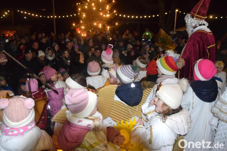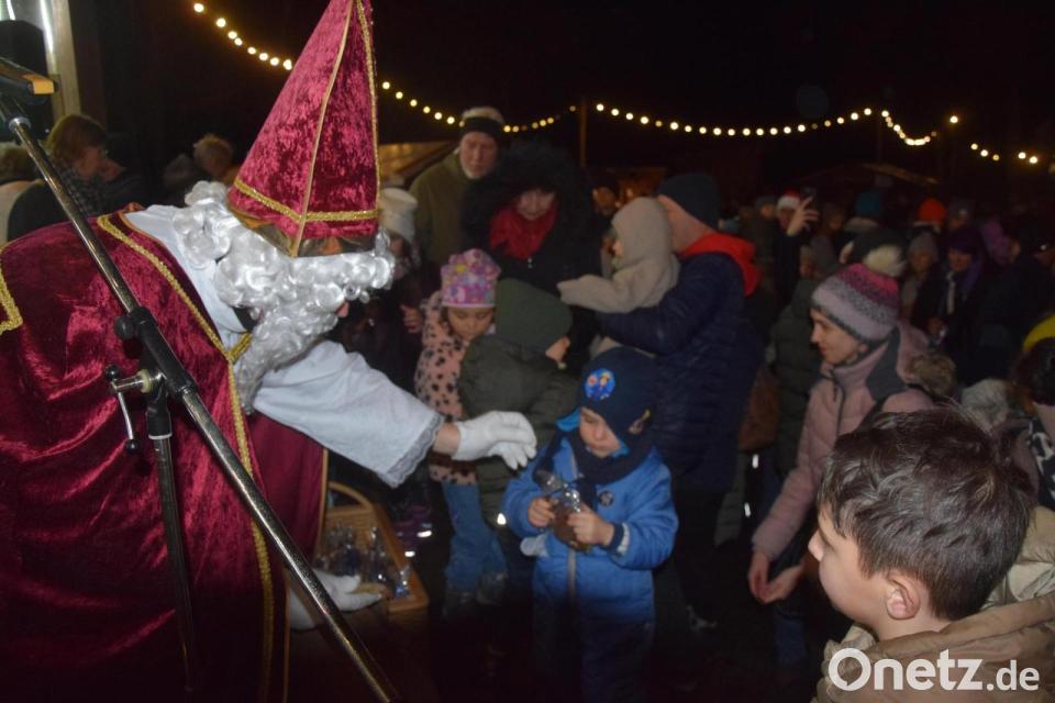 „Allen Bürgern, groß und klein, soll Weihnachtsfrieden beschieden sein“, wünschten die beiden Himmelsboten den einigen Hundert Besuchern vor der Bühne. „Alle Kinder, die ihr hier seid, wir haben ein Weihnachtssäckchen für euch bereit“, verkündete der Nikolaus, und die Kinder drängten zur Bühne, um ihr diesjähriges erstes Weihnachtsgeschenk zu empfangen.