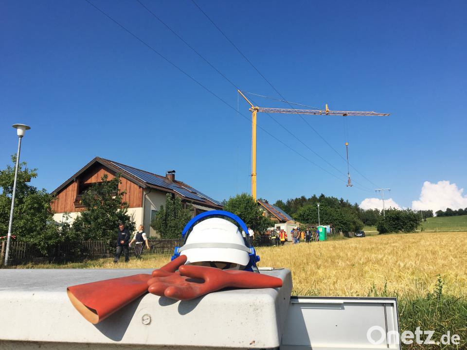 Zwischenzeitlich informierte die Polizei die Anlieger in Edeldorf von dem Vorfall und beorderte die direkten Nachbarn der Baustelle aus Sicherheitsgründen zu einem Bauernhof. Zwei Bauarbeiter befanden sich oben auf dem Rohbau und scheuten zunächst den Weg herunter. „Sie hatten Angst, dass das Gerüst unter Strom stand“, sagte Tom Kreuzer von der Polizeiinspektion Neustadt.