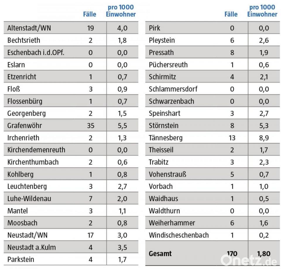 - Die meisten Coronafälle binnen einer Woche: Grafenwöhr (35, Vorwoche: 28), Altenstadt/WN (19, Vorwoche: 5), Neustadt/WN (17, Vorwoche: 5), Tännesberg (13, Vorwoche: 3), Pressath (8, Vorwoche: 4), Störnstein (8, Vorwoche: 5).
