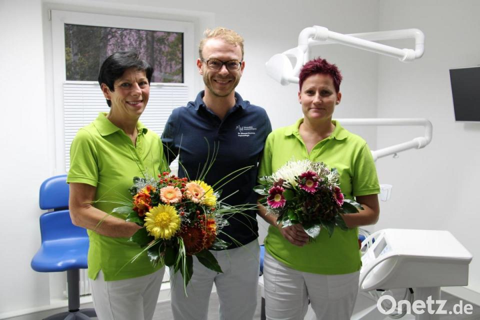 Ihr Chef Dr. Klemens Mark überreichte den beiden langjährigen Mitarbeiterinnen Blumen verbunden mit dem Dank für ihre Treue und ihre Leistungen.„Eigentlich war es am Anfang nicht mein Traumberuf“, erinnerte sich Maria Schubert, als sie 1975 die Ausbildung zur Zahnarzthelferin in der Praxis von Dr. Gerhard Naber in Neustadt begann. Nach der Praxiseröffnung von Dr. Bernhard Mark im September 1979 wechselte sie in die Zacharias-Frank-Straße 30 und ist seitdem dort tätig. „Unser Berufsbild hat sich gewaltig gewandelt“, erzählt sie. Heute gäbe es keine Zahnarzthelferinnen mehr, sondern Zahnmedizinische Fachkräfte, die dem Dentisten viele selbständige Arbeiten wie Abdrücke machen oder Zahnreinigung, abnehmen.