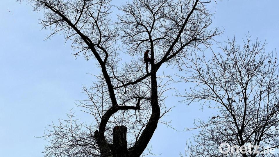 Ein Baumkletter sägt in der Pappel am nördlichen Stadtrand von Neustadt/WN einen Ast ab.