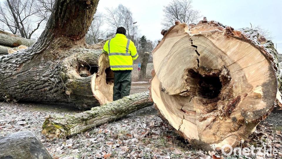 Ihn den gewaltigen Stämmen und Ästen der Alleepappeln bei der DJK Neustadt werden auch einige Schäden sichtbar.