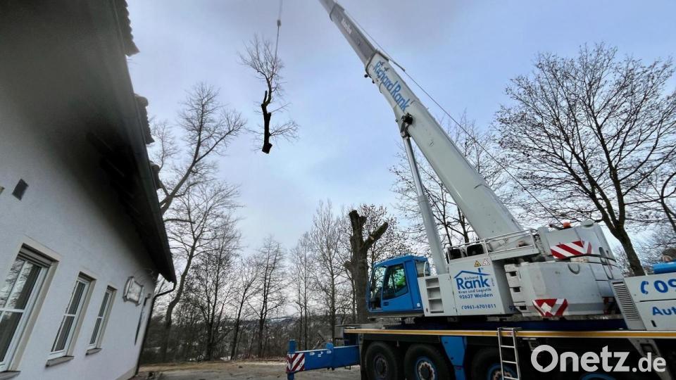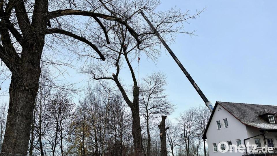 Die Entfernung der riesigen Bäume an der DJK Neustadt ist eine schwierige Aufgabe, bei der auch ein Autokran mit im Einsatz ist.