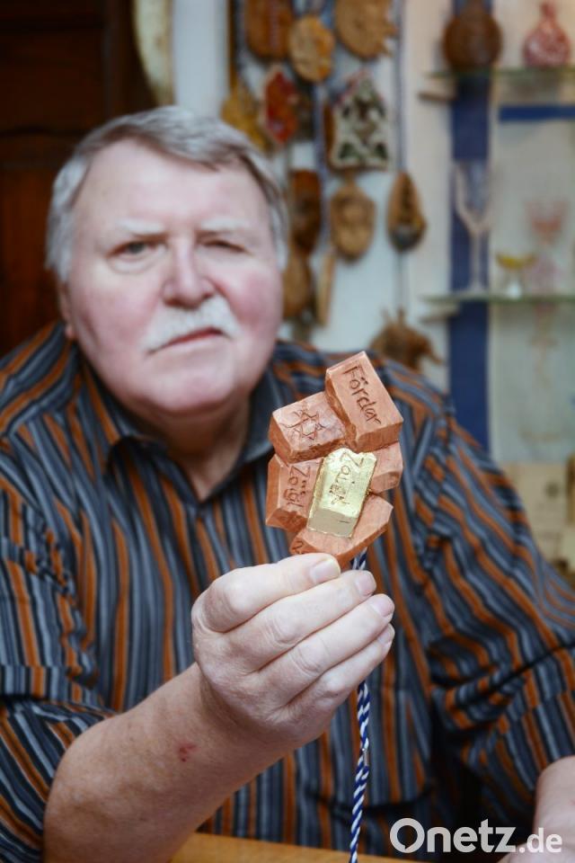 Allein sprachlich hat der Schnitzer darauf schon angedeutet, dass das Kommunbier für den Oberpfälzer ein wichtiger Baustein des Lebens ist. Zwei kleine Strichlein auf des Zoigls "o" ins Holz geschnitten, verwandeln das Wort zum Ziegel. Rund vier Stunden sitzt der 68-Jährige, bis die handgefertigten Auszeichnungen aus Südtiroler Zirbenholz fertig sind. Zwar hält er sich an die von ihm gefertigte Vorgabe, aber jedes der gut 50 Exemplare ist doch ein wenig anders, jedes ein Unikat und jedes mit einem goldenen Ziegel als Blickfang im Zentrum.
